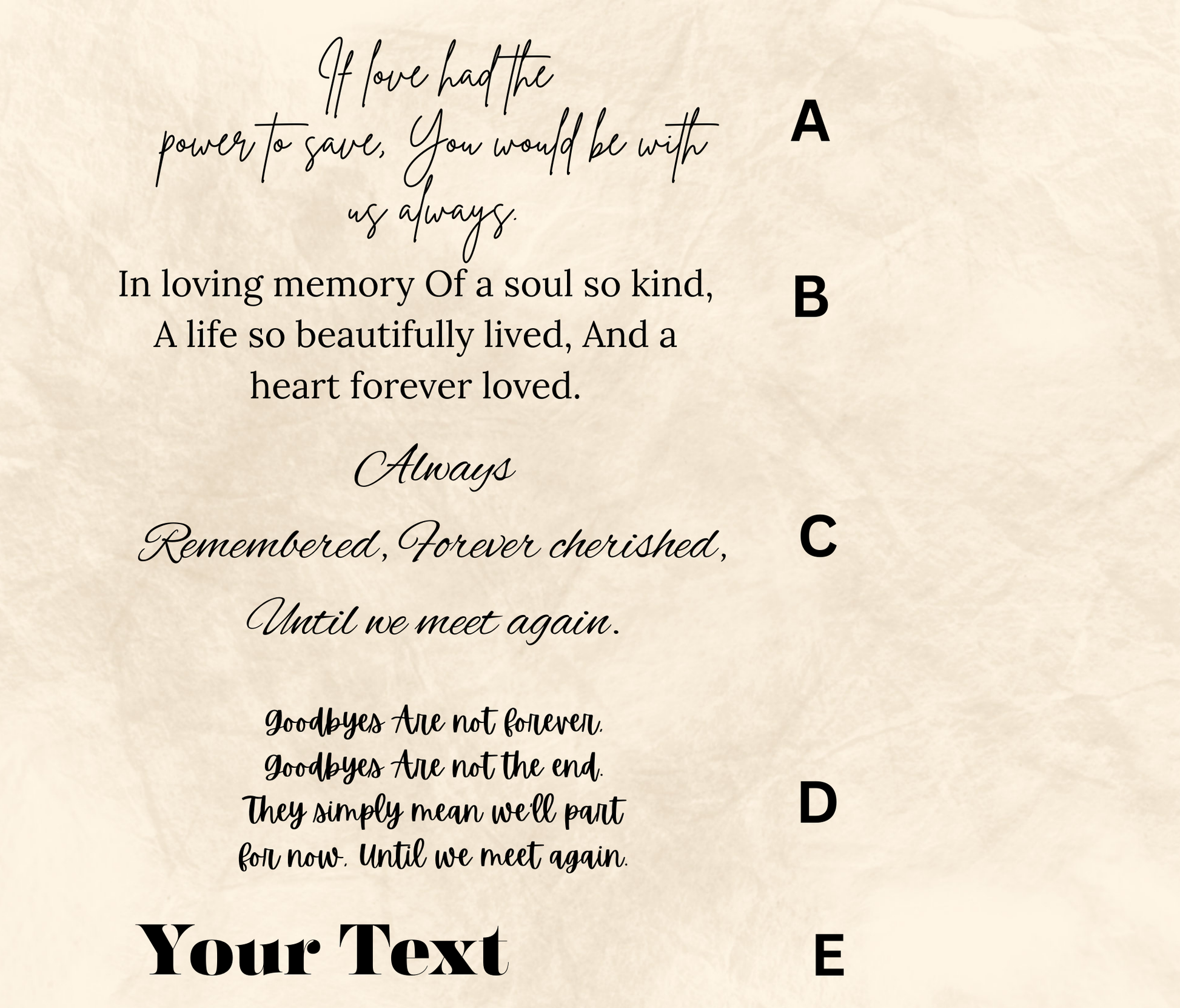 Fully Personalized – Upload a photo, add a name, dates, or a short quote such as “Forever in my heart.” We’ll craft the layout so the design truly sings.