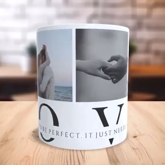 L O V E in elegant serif letters, each framed by four of your favorite photos and the heartfelt quote: “Doesn’t need to be perfect, it just needs to be true.”