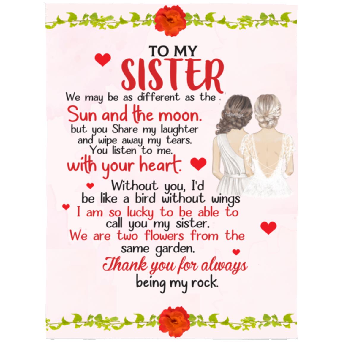 Celebrate the special bond with your sister with the "To My Sister" blanket. Made with high-quality materials, this cozy blanket is perfect for cuddling up and reminiscing about cherished memories. Show your sister how much she means to you with a heartfelt gift that she can use every day.